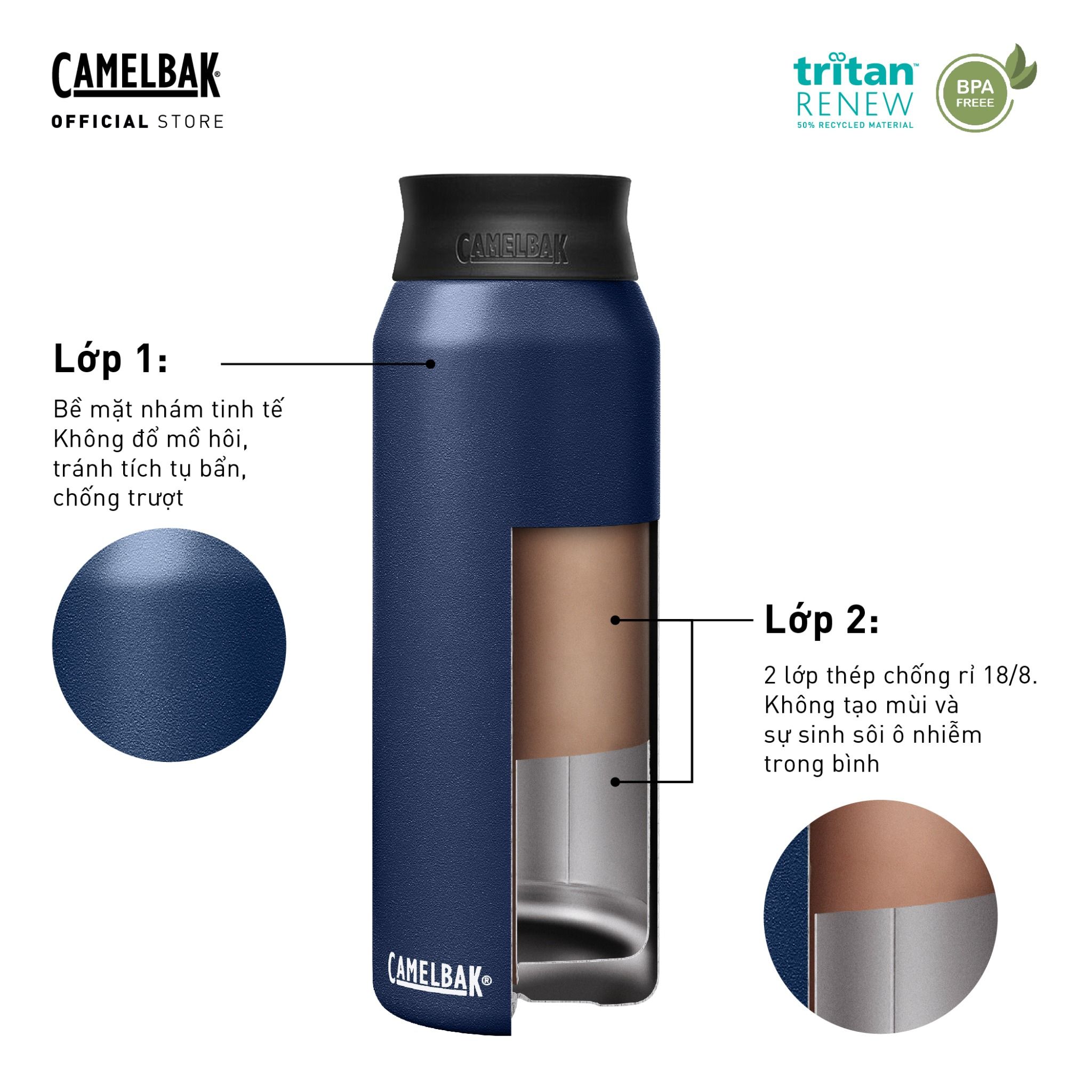 THÀNH BÌNH 2 LỚP GIỮ NHIỆT NÓNG LẠNH: Thành bình bằng thép không gỉ 2 lớp giúp giữ thức uống nóng hoặc lạnh hàng giờ (thời gian tùy thuộc vào dung tích bình) và chống hiện tượng đổ mồ hôi trên thành bình hiệu quả.